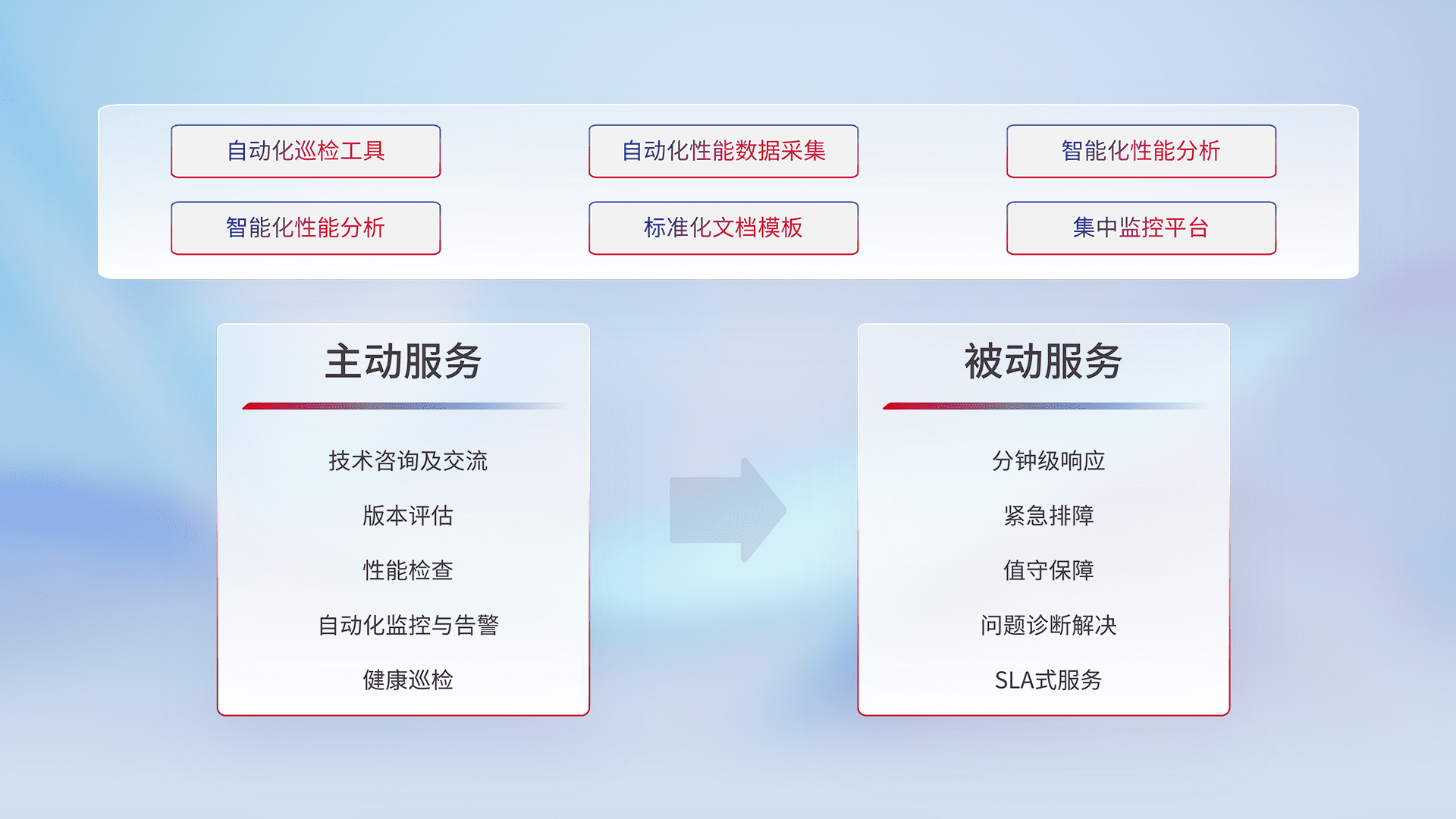 智能化工具和标准化文档,,保障服务质量,,,提供主动服务(包含技术咨询、、、版本评估、、、、性能检查、、、、自动化监控与告警、、、、健康巡检)和被动服务包含(分钟级响应、、、、紧急排障、、、、值守保障、、问题诊断解决、、、SLA服务)。。